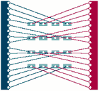 16-узловая система хранения данных, представленная в виде grid-конфигурации. В grid-конфигурации сеть из 16 узлов можно разбить на четыре сегмента по четыре узла, и каждый из этих сегментов подключить к четырехпортовому коммутатору. В дополнение к этому еще четыре таких коммутатора можно подключить к одному из узлов в каждой из четырех групп. В итоге мы опять получим 32 проводных соединения (как и в предыдущем случае), но не два 16-портовых коммутатора, а восемь четырехпортовых (количество портов таким образом осталось неизменным). Каждый из узлов сети подключен опять-таки к двум коммутаторам. Однако в случае отказа одного из коммутаторов в grid-конфигурации остается множество возможных маршрутов для обмена данными между узлами. Иными словами: grid-конфигурация обладает значительно большей надежностью и устойчивостью. Еще одно достоинство: расширение сети предполагает лишь установку дополнительных коммутаторов с небольшим количеством портов, и при этом не требуется проектировать заново структуру сети.