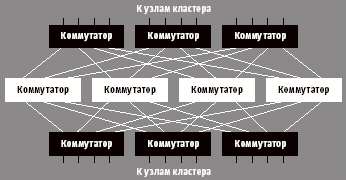 Наконец, в-третьих, в К-1000 применяется межсоединение Infiniband (см. рис.). Конечно, Infiniband еще нельзя отнести ни к классике, ни даже к «новейшей классике»: инсталляций подобных кластеров в мире пока немного, однако Infiniband за последний год начал набирать обороты, и имеет шансы потеснить специализированные кластерные межсоединения типа Quadrics или Myrinet.