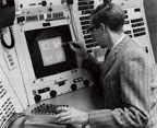 | Иван Сазерленд демонстрирует работу системы Sketchpad на консоли компьютера TX-2, установленного в MТИ |
