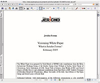 Одним из шагов, предпринятых Jericho Forum, чтобы сдвинуть дело с мертвой точки, стал конкурс на создание детальной архитектуры защиты на основе идеи «разрушения периметра». Такую архитектуру можно было бы использовать для безопасной работы с Internet систем аутентификации обращений к базам данных и доступа к Web-порталам. Единственный документ, описывающий концепцию «разрушения периметра», опубликован в феврале под названием Visioning White Paper. Его можно найти на Web-сайте Open Group, консорциума, который пропагандирует открытые стандарты и возглавляет форум.