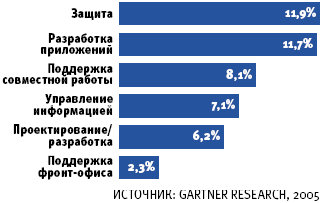 Результаты аналитических исследований компании Gartner показывают, что инвестиции в средства обеспечения информационной безопасности растут быстрее затрат на ИТ в целом. Приведенные ниже цифры показывают, какие затраты в составе ИТ-бюджетов в 2005 году в сравнении с прошлым годом увеличились более всего