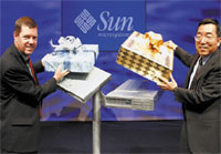 | Скотт Макнили и Дэвид Йен торжественно открывают коробки с «подарками» мировому компьютерному бизнесу |