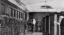 | Внушительный по виду агрегат, ENIAC содержал в центральном процессорном устройстве 17468 вакуумных ламп, занимал площадь более 200 квадратных метров, потреблял 174 киловатт электроэнергии |