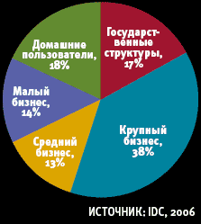 По данным исследований IDC, доля сектора SMB на российском ИТ-рынке не превышает 27%, в то время как крупный бизнес занимает 38%. Если же рассматривать сегменты малого и среднего бизнеса отдельно, их удельный вес отстает как от государственных структур, так и от домашних пользователей