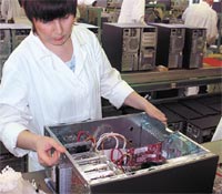 Конвейерный участок на производстве заработал первым. Сейчас он может выпускать 600 ПК в смену. В центре него находится замкнутая многоярусная термокамера (температура — 42 ?C). Компьютеры во включенном состоянии помещаются в нее на 24 часа. Поддоны, на которые они устанавливаются, имеют токопроводящие полосы, поэтому во время их движения по камере питание сохраняется. В течение этого времени выполняются функциональные тесты. Интеллектуальная система загружает системные блоки в камеру, а затем выгружает их в той же последовательности.