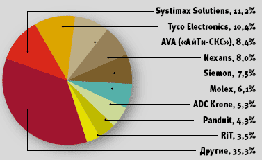В 2005 году лидером рынка медных СКС по-прежнему оставалась компания Systimax. Tyco устойчиво занимает вторую позицию. AVA опередила Siemon, с которой в 2004 году делила третье место (данные в диаграмме приведены без учета OEM-поставок)