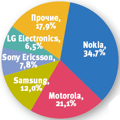 Это на 7,9% больше, чем во II квартале и на 21% превышает аналогичные показатели 2005 года. Лидером рынка осталась компания Nokia, поставки которой достигли 88,5 млн. трубок, что обеспечило ей 34,7% рынка (показатели III квартала прошлого года — 66,6 млн. трубок и 31,6%). Далее следуют Motorola (53,7 млн., 21,1%; 38,7 млн., 18,4%), Samsung (30,7 млн., 12,0%; 26,4 млн., 12,6%), Sony Ericsson (19,8 млн., 7,8%; 13,9 млн., 6,6%), LG Electronics (16,5 млн., 6,5%; 15,5 млн., 7,4%). Аналитики IDC полагают, что приближающиеся рождественские праздники изменят структуру продаж на развитых рынках, где спрос пользователей смещается от сверхтонких моделей в мир мобильной музыки.