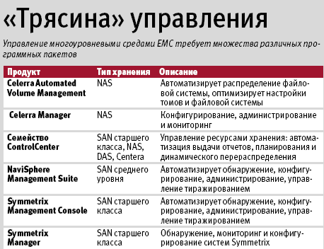 Что же касается конкурентов EMC, то у IBM есть единый пакет управления под названием IBM TotalStorage Productivity Manager Standard Edition, у HP — пакет Storage Essentials Enterprise Suite Software, а у Hitachi Data Systems — HiCommand Resource Manager Utility.