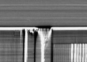 В Национальном институте стандартов и технологий США разработана предназначенная для нужд судебной экспертизы система магнитной микроскопии, позволяющая выявить следы вмешательства в оригинальную запись на аудио- или видеопленке. Система предусматривает размещение в кассетной деке кроме обычной головки чтения еще одной, выполненной на основе кремниевого чипа и массива микроскопических датчиков. Показания с них поступают на компьютер, программное обеспечение на котором формирует трехмерное изображение структуры магнитного покрытия ленты. На иллюстрации приведен образец такой модели: характер левой части изображения свидетельствует о том, что на данном месте процесс записи был приостановлен. Система позволяет оператору увидеть всю «историю» операций с пленкой, таких как перезапись и стирание.