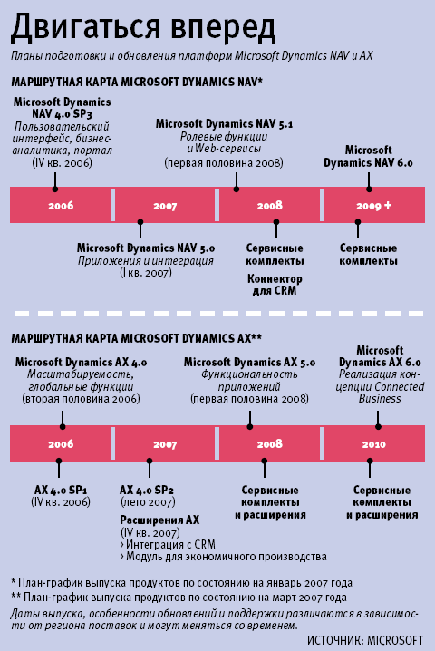 Развитие продуктов семейства Microsoft Dynamics разбито на два этапа. Первый начался в 2005-м и заканчивается в 2007 году, второй намечен на 2008-2009 годы. Основными новыми задачами, которые планировалось реализовать во всех продуктах семейства на первом этапе, было проектирование функциональных модулей с учетом бизнес-ролей пользователей, интеграция всех пяти продуктов с порталами SharePoint и инфраструктурой документооборота, задействование возможностей контекстной бизнес-аналитики, имеющейся в новой версии Microsoft SQL Server 2005, а также легкая интеграция и расширение возможностей прикладных решений через использование Web-сервисов. Задачами второго этапа становятся улучшение функциональных возможностей, доступных конечному пользователю, проектирование продуктов с учетом требований документооборота и технологий управления бизнес-процессами, отбор «наилучших» бизнес-функций каждого приложения и реализация моделей при разработке и настройке приложений.