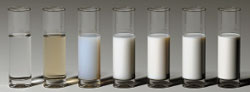 Достижения в сфере компьютерной графики начинают выходить за привычные рамки получения как можно более реалистичной картинки для игр и кинофильмов. Используя уравнения Максвелла, описывающие рассеяние электромагнитных волн сферической частицей в непоглощающей среде, ученые Калифорнийского университета в Сан-Диего разработали алгоритм генерации изображения молока на основе данных о содержании в нем его составляющих (на иллюстрации слева направо: стаканы, содержащие воду, воду и витамин B