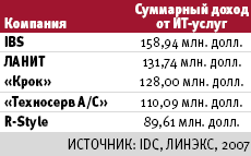 В IDC подчеркивают, что проведенные исследования не носят рейтингового характера, а призваны в первую очередь дать объективное представление о состоянии дел на рынке ИТ-услуг России. Однако к любым рейтингам в нашей стране традиционно проявляют повышенный интерес: специалистов интересуют конкретные результаты и положение компаний на рынке. Пятерка ведущих российских поставщиков ИТ-услуг по результатам работы в 2006 году сформирована на основе данных, скорректированных по методике ЛИНЭКС; в них включены доходы от офшорных работ, но не учтены контракты с субподрядчиками.