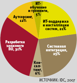 Изменилась и структура рынка. Наибольшая доля доходов, как отметил Прохоров, сместилась из сегмента системной интеграции в область разработки заказного программного обеспечения. Отмечается заметный рост доходов за счет аутсорсинга и консалтинга в области информационных систем.