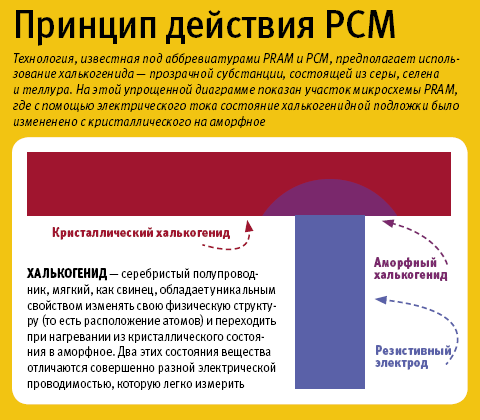 А между тем в мире появилась новая твердотельная технология — память на основе фазовых состояний. Эта технология, известная под аббревиатурами PRAM и PCM, предполагает использование халькогенида — прозрачной субстанции, состоящей из серы, селена и теллура. Серебристый полупроводник, мягкий, как свинец, обладает уникальным свойством изменять свою физическую структуру (то есть расположение атомов) и переходить при нагревании из кристаллического состояния в аморфное. Два этих состояния вещества отличаются совершенно разной электрической проводимостью, которую легко измерить. Таким образом, халькогенид превращается в идеальный материал для хранения данных.