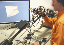 Группа европейских научных учреждений в рамках проекта HAPTEX разрабатывает периферийное устройство для компьютера, позволяющее «ощупывать» руками ткани, отображаемые на дисплее. Система состоит из каркаса кронштейнов, создающих эффект обратной связи по усилию, и двух игольчатых матриц, которые передают подушечкам пальцев ощущение «прикосновения» к ткани. Каркас, в свою очередь, позволяет «растягивать» экранную ткань, ощущая при этом, насколько она упруга. По словам авторов проекта, они видят возможности применения необычного приспособления в текстильной промышленности, в онлайн-магазинах, а также в компьютерных играх, которые подобное устройство могло бы сделать более реалистичными. На сегодня создан действующий прототип системы, и создатели рассчитывают со временем разработать коммерческий продукт на его основе.