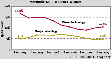 Бессменным номером один мирового рынка микросхем DRAM в последние годы является корейская корпорация Samsung, с завидным постоянством лидирующая в рейтингах iSuppli и других исследовательских организаций. За второе место еще не так давно спорили, в основном, Hynix и Micron, но неудачи второй половины позапрошлого года отбросили американскую компанию за пределы первой тройки. С тех пор доля рынка Micron колеблется в районе 10%, в то время как в первом квартале 2005 года, согласно данным iSuppli, она составляла 16,8%, а еще чуть раньше, в четвертом квартале 2004 года — и вовсе 21,1%. У Nanya после успешного 2006 года также наметилась неприятная тенденция к снижению доли рынка, хотя оно и не было таким резким, как в случае с Micron. Финансовые неурядицы последних кварталов, ставшие следствием общей неблагоприятной ситуации на мировом рынке DRAM, очевидно, подталкивали обе компании к активизации поисков путей выхода из кризиса. В результате, как это часто бывает в кризисные времена, это привело к образованию альянса, который прежде многим казался невозможным.