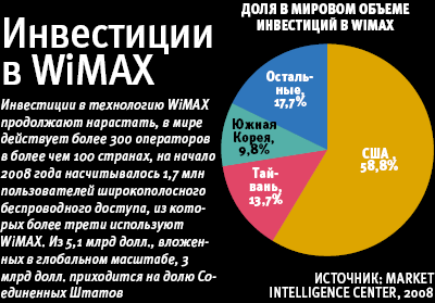 По словам Константина Анкилова, аналитика iKS Consulting, инвестиции в технологию продолжают нарастать, в мире действует более 300 операторов в более чем 100 странах, на начало 2008 года насчитывалось 1,7 млн пользователей широкополосного беспроводного доступа, из которых более трети (0,7 млн) используют технологию WiMAX. Объем рынка сертифицированного WiMAX Forum оборудования составил 0,17 млрд долл. В 2009 году ожидается рост количества пользователей до 7 млн, в 2014-м — до 100 млн, причем половина этого роста придется на страны Азии.