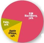Платформа BlackBerry компании Research in Motion продолжает лидировать в сегменте корпоративных смартфонов, занимая, по данным исследования ChangeWave Research, 76% рынка в ноябре 2008 года. В этом же месяце впервые удалось поколебать позиции второго игрока рынка бизнес-коммуникаторов — компании Palm. Смартфон Apple iPhone увидел свет в конце июня прошлого года, и уже к августу этого года занимал 9% корпоративного сектора, уступая Palm с ее 15%. В ноябре отмечается резкий подъем популярности iPhone: доля Apple составила 14%, у Palm — лишь 10%. При этом выход iPhone 3G, состоявшийся в июле этого года, положительно к дальнейшему приобретению восприняли только 18% респондентов — соответственно, нельзя объяснить рост популярности iPhone только появлением его второго поколения. Любопытно, что практически все ИТ-компании, работники которых используют BlackBerry, относятся к крупным, располагая штатом свыше тысячи сотрудников, тогда как три четверти пользователей iPhone работают в организациях с числом сотрудником менее 1 тыс.