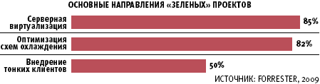 Как отмечают аналитики Forrester, большая часть проводимых проектов предполагает изменения как в ЦОД, так и в компьютерном парке организаций. При этом около 50% руководителей компаний, ставя перед ИТ-подразделениями цели, ограничиваются сокращением электроэнергии. Еще 40% пытается сохранить совершенные инвестиции и говорит о продлении срока жизни приобретенных решений. Основными практическими направлениями «зеленых» проектов является серверная виртуализация, построение более эффективных схем охлаждения, а также внедрение тонких клиентов.