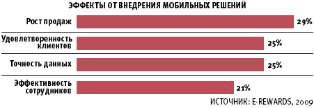 Согласно результатам исследования, проведенного e-Rewards, на предприятиях, использующих мобильные решения, экономия времени каждого из работников составляет в среднем 42 минуты ежедневно. Более четверти опрошенных отметили управление запасами и приложения для сотрудников в сфере продаж как наиболее важные направления инвестиций в мобильные решения. Более половины предприятий планируют полностью окупить вложенные средства в течение 15 месяцев с момента первоначальных вложений.