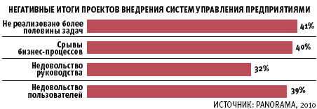 Согласно результатам исследования Panorama Consulting, 57% проектов внедрения ERP длились существенно дольше запланированного, а 54% — не уложились в бюджет. Отдельно исследование коснулось негативных результатов ERP-проектов, про которые обычно предпочитают молчать вендоры. Наиболее общими из них являются несоответствие созданного решения своим задачам (зачастую остаются нереализованными более половины целей проекта), срывы бизнес-процессов во время запуска системы в эксплуатацию и неудовлетворенные пользователи.