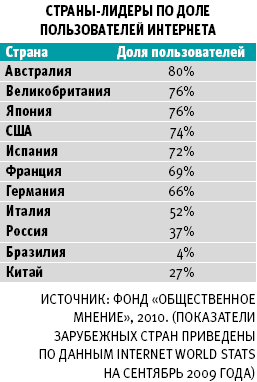 Именно столько наших сограждан посещают ресурсы Сети каждые сутки. Рост активной аудитории за последний квартал 2009 года составил около 8%, а за пять последних лет — 500%. Кроме того, не реже одного раза в полгода Интернетом пользуются 43,3 млн россиян, что составляет около 37% взрослого населения страны. По этому показателю Россия все еще уступает ведущим государствам мира, опережая лишь Бразилию (на 3%) и Китай (на 10%). Лидером по количеству пользователей в РФ является Центральный федеральный округ (13,2 млн человек). При этом в ЦФО только на Москву приходится 5,8 млн интернет-пользователей.