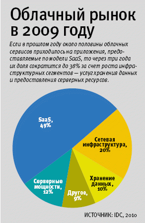 Взгляд зарубежных аналитиков на перспективы развития рынка облачных сервисов представил консультант IDC Мэтью Маккормак. Согласно оценкам аналитиков, расходы на ИТ-сервисы, предоставляемые из облаков, увеличатся с 17,4 млрд долл. в 2009 году до 44,2 млрд долл. в 2013 году. Это соответствует весьма внушительным среднегодовым темпам роста на уровне 26%. При этом, если в прошлом году около половины этих сервисов приходилось на приложения, предоставляемые пользователям по модели SaaS, то через три года их доля сократится до 38% за счет роста инфраструктурных сегментов — услуг хранения данных и предоставления серверных ресурсов.