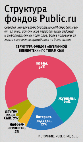 В 2000 году Public.ru имела накопленный за предыдущие десять лет архив публикаций из 750 источников, которые можно было анализировать по авторам, темам, датам и заголовкам. В настоящее время источников около 3,5 тыс. — в основном за счет охвата региональных СМИ и информационных порталов. Около 44% источников библиотеки — московские СМИ, 45% — региональные, 4% приходится на источники из Санкт-Петербурга, ближнее и дальнее зарубежье дают 6% и 1% соответственно.