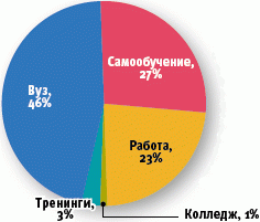Самостоятельно осваивали азы специальности 27% опрошенных, в ходе работы в компании обучались 23% специалистов, 3% посещали тренинги, а 1% ограничился обучением в среднем специальном учебном заведении. Лидерами по выпуску ИТ-директоров среди столичных вузов являются МГТУ им. Н. Э. Баумана, МИФИ, МГУ, МАИ и МФТИ. Что любопытно, половина опрошенных ИТ-руководителей никогда не получали дополнительного образования по специальности.