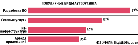 По данным опроса, проведенного in4media, к 2012 году абсолютное большинство крупных российских предприятий будут приобретать те или иные услуги ИТ-аутсорсинга. При этом 73% опрошенных предприятий уже привлекают внешних поставщиков ИТ-услуг. Наиболее популярными услугами остаются аутсорсинг разработки ПО и аутсорсинг сетевых услуг. Интересно, что абсолютное большинство компаний считают свой опыт аутсорсинга ИТ-услуг успешным и утверждают, что он помог достичь поставленных целей.
