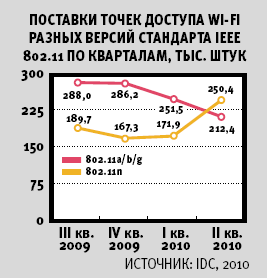 Быстрому распространению протокола беспроводных локальных сетей IEEE 802.11n в корпоративной среде не помешал даже экономический кризис. Немного притормозив в конце 2009-го — начале 2010 года, точки доступа нового варианта стандарта Wi-Fi быстро замещают своих предшественников. По данным IDC, в течение 2009 года было поставлено 520,4 тыс. точек доступа, в первой половине 2010-го — уже 422,3 тыс.