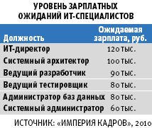 По данным компании «Империя Кадров», летом количество вакансий в сфере ИТ увеличилось по сравнению с началом года почти в полтора раза. Более того, к осени спрос увеличился по сравнению с летом еще на 20%. Данная тенденция сохранится как минимум до конца 2010 года. В свою очередь, это обусловливает и рост уровня заработных плат. Наибольшее количество вакансий наблюдается в сфере разработки: чаще всего требуются разработчики «1С» и Java. По-прежнему высоким остается спрос на кандидатов наиболее высокой квалификации (старшие разработчики, специалисты SAP, системные архитекторы).