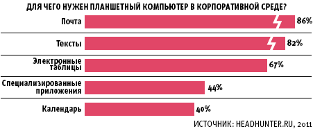 Для 56% опрошенных порталом HeadHunter.ru пользователей планшетных компьютеров данное устройство в первую очередь является рабочим инструментом. Подавляющее большинство тех, кто пользуется планшетником для решения рабочих вопросов, в основном ведут деловую переписку или работают с текстовыми редакторами. Кроме того, более половины опрошенных пользуются электронными таблицами, а 40% ведут рабочий календарь. Специализированные программы используют лишь 44% опрошенных.