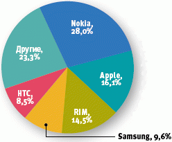 Компания IDC опубликовала отчет по данным о продажах смартфонов в четвертом квартале 2010 года. По данным аналитиков, в четвертом квартале поставщиками было отгружено в общей сложности 100,9 млн смартфонов, что на 87,2% больше, чем за аналогичный период 2009 года. Первое место среди производителей по-прежнему удерживает Nokia, хотя занимаемая ею доля рынка в четвертом квартале сократилась более чем на четверть. На втором месте в списке производителей Apple, сохранившая свою долю рынка. В тройку лидеров вошла также компания RIM. При этом наибольшие темпы роста продемонстрировали производители устройств, работающих на базе Android, — компании Samsung и HTC.