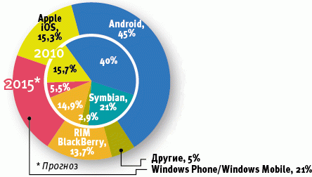 По прогнозу аналитиков IDC, уже в 2011 году Android станет самой распространенной мобильной операционной системой и сохранит лидерство в течение следующих пяти лет. К 2015 году на второе место выйдет Windows Phone. Сегмент смартфонов на платформе Windows Phone вырастет благодаря усилиям альянса между крупнейшим в мире производителем мобильных телефонов Nokia и локомотивом программной отрасли Microsoft. Появления первых устройств, выпущенных альянсом, в IDC ожидают в 2012 году. Прежний лидер, операционная система Nokia Symbian, сохраняющая в 2011 году второе место с долей 21%, к 2015 году уйдет с рынка. После 2012 года Nokia не планирует выпускать телефоны на платформе Symbian. Глобальное увеличение продаж смартфонов составит 49,2%. В 2011 году поставщики отгрузят более 450 млн смартфонов, в то время как в 2010 году было продано 303,4 млн устройств.