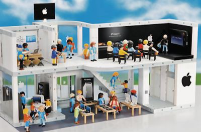 Онлайн-магазин Thinkgeek.com, торгующий товарами для помешанных на компьютерах, науке и технике, 1 апреля предложил покупателям уменьшенную модель магазина Apple, якобы выпущенную под маркой Play Mobil. Товар сопровождался реалистичными фотографиями и даже видеороликом: на полках псевдомагазина разложены уменьшенные модели iPhone, Macbook и iPad, а на втором этаже в конференц-зале выступает фигурка самого Стива Джобса.