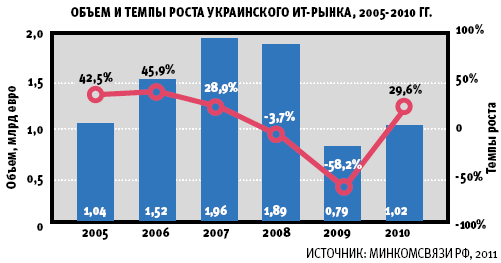 По данным аналитиков исследовательской компании PMR, украинский ИТ-рынок, выросший в 2010 году почти на 30%, вновь преодолел символический уровень в 1 млрд евро, впервые достигнутый в 2005 году. Впрочем, это по-прежнему вдвое меньше, чем в рекордном 2007-м. Кризис обрушил и потребительский, и корпоративный сегменты рынка. Количество национальных программ, предусматривавших реализацию ИТ-проектов, в 2009 году было сокращено вдвое, а расходы местных бюджетов были ограничены исключительно обслуживанием и техподдержкой. В 2010 году правительство даже направило в регионы письмо, запрещавшее покупку новых компьютеров. Постепенному восстановлению рынка способствует экономический подъем, а также относительная политическая стабильность.