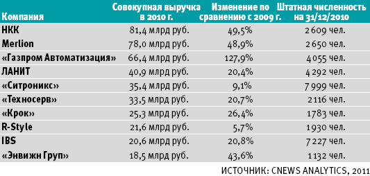 По данным опубликованного CNews Analytics рейтинга, в 2010 году совокупная выручка 100 крупнейших отечественных ИТ-компаний достигла рекордных 757 млрд руб. По сравнению с 2009 годом рост составил 45%. На компании первой десятки рейтинга приходится 55,7% общей выручки. Половину участников рейтинга указывают как приоритетное направление своей деятельности ИТ-услуги.
