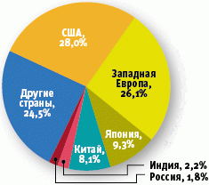 По данным World Bank, общемировой объем затрат на информационно-коммуникационные технологии составит в 2011 году 3,3 трлн долл. Долю российского рынка ИКТ эксперты авторитетного финансового института оценили в 1,8% мирового, то есть 59,4 млрд долл., или примерно 1800 млрд руб. Безусловным лидером остаются Соединенные Штаты, на которые приходится около 30% рынка ИКТ. Опережают Россию и «коллеги» по группе БРИК — Китай (8,1%) и Индия (2,2%).