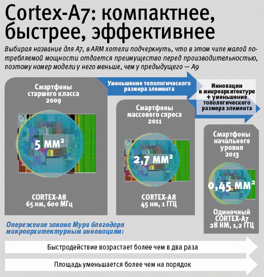 Площадь кристалла A7 составит меньше 0,5 кв. мм, а потребляемая мощность будет ниже 500 мВт, сообщил Нандан Наямпалли, директор по маркетингу процессорного подразделения ARM.