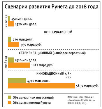 Объем инвестиций в интернет-проекты за два последних года увеличился с 537 млн долл. до 966 млн, а их количество со 161 до 230. Многие молодые люди настроены стать предпринимателями: 15% студентов ИТ-специальностей хотели бы открыть бизнес, а 6% уже планируют это сделать сразу после окончания института. Большинство из них, как и большинство инвесторов, ориентировано на интернет-проекты. Однако достигнутый уровень инвестиционной активности пока еще невысокий.