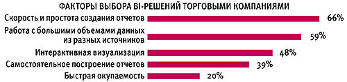 Как показало исследование, проведенное компанией Qlik совместно с порталом Retail.ru и консалтинговой группой АТК, при выборе системы бизнес-аналитики торговыми компаниями в первую очередь ценятся скорость и простота создания отчетов. Еще одним важным фактором является их «всеядность» — возможность работы с многочисленными источниками данных. Наиболее широко системы бизнес-аналитики используются для анализа продаж и финансовых показателей, закупочной деятельности и маркетинга, а работают в таких системах в основном руководители среднего звена и топ-менеджеры, в меньшей степени — рядовые сотрудники и владельцы. В качестве сдерживающих факторов многие отмечают высокую стоимость внедрения и длительность проектов. Кроме того, специалистов беспокоит неготовность инфраструктуры компании в целом, а особенно качество данных.