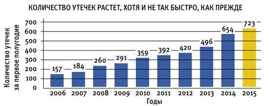 Тенденции же таковы, что количество утечек продолжает расти: в первой половине 2015 года зарегистрировано 23 случая утечки — на 10% больше, чем годом ранее. Казалось бы, немного, но в действительности это означает, что были похищены сотни миллионов записей персональных данных. В отчете говорится о росте числа крупных инцидентов, когда было скомпрометировано сразу свыше 10 млн записей. На такие утечки пришлось 83% скомпрометированных записей. Примерно в 90% случаев «утекают» персональные данные и платежная информация; в этом по сравнению с прошлым годом ситуация практически не изменилась.