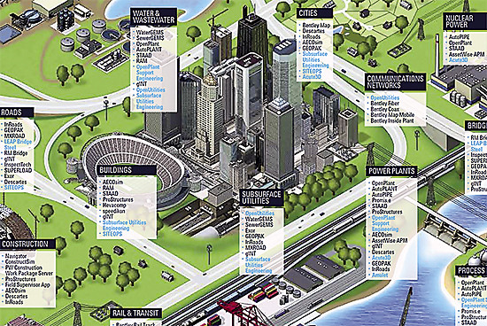 Все многообразие своих решений Bentley систематизирует в трех основных семействах: MicroStation — платформа 3D-моделирования объектов инфраструктуры и отраслевые приложения на ее основе (на конференции была представлена новая, 64-битная версия решения); ProjectWise — система управления комплексными проектами, объединяющая различные подразделения организации и ее внешних контрагентов; AssetWise — решение для управления объектами инфраструктуры на этапах строительства и эксплуатации с использованием данных, созданных на этапе проектирования.