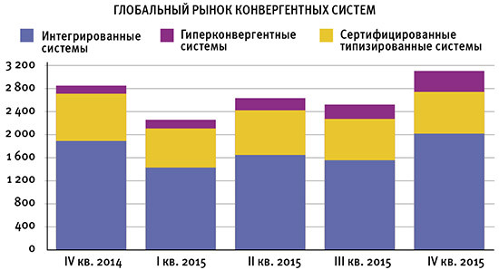 В четвертом квартале 2015 года мировой объем продаж конвергентных систем достиг 3,1 млрд долл., что на 8,5% больше, чем в четвертом квартале предыдущего года. За год в целом объем рынка конвергентных систем вырос на 8,3%, до 10,6 млрд долл. Объем продаж интегрированных систем, включающих серверное оборудование, системы хранения, сетевое оборудование и основные программы управления, за квартал превысил 2 млрд долл., на 6,7% больше прошлогоднего. Лидер в этом сегменте — VCE (743 млн долл.). Продажи сертифицированных типизированных систем (с компонентами различных производителей) упали на 13,1%, до 718,6 млн долл. В этом сегменте лидер — альянс Cisco и NetApp с долей в 46,9%. На сегмент гиперконвергентных систем, которые с высокой степенью виртуализации объединяют вычислительные функции и функции хранения, приходится 11,4%. За год продажи таких систем выросли на 170,5% и составили в четвертом квартале 355,9 млн долл. Спрос смещается в средний ценовой сегмент, где преобладают именно гиперконвергентные системы.