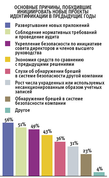Основной причиной, побудившей компании инициировать в последние годы новые проекты идентификации, 56% респондентов, представляющих небольшие, средние и крупные организации, назвали развертывание новых приложений. О решениях совета директоров и членов высшего руководства упомянули 50% респондентов, они подчеркнули, что теперь вопросы кибербезопасности непременно выносятся на уровень совета директоров.