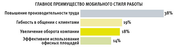 По данным Citrix, 78% сотрудников имеют возможность работать за пределами офиса; 22% не могут работать удаленно, чаще всего это связано со спецификой их деятельности. Использование мобильных технологий положительно сказывается на организации рабочих процессов. Около 70% респондентов отметили их положительное влияние на продуктивность работы в целом и эффективность командной работы. Основной негативный фактор — угроза сохранности данных. К возможным рискам относятся как сохранность самого устройства, так и несанкционированный доступ к нему, а также утечка конфиденциальной информации по контролируемым каналам связи. Еще один немаловажный негативный эффект — феномен «всегда на работе». Кроме того, внедрение мобильных технологий требует определенных вложений, что становится препятствием при переходе на новый стиль работы сотрудников.