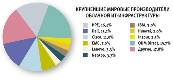 Во втором квартале 2016 года объем мирового рынка оборудования для облачной инфраструктуры (серверов, систем хранения и коммутаторов Ethernet) вырос по сравнению со вторым кварталом прошлого года на 14,5% и достиг 7,7 млрд долл. Доля оборудования, предназначенного для облачных систем, в общем объеме продаж выросла с 30,6% в прошлом году до 34,9%. При этом продажи оборудования для частных облачных систем выросли на 14%, до 3,1 млрд долл., а для публичных — на 14,9%, до 4,6 млрд долл. Продажи инфраструктурного оборудования традиционного назначения снизились на 6,1%. Лидером рынка остается HPE, однако аналитики предупреждают, что скрытым фаворитом, который уже в ближайшем будущем займет первую строчку рейтинга, является объединенная компания Dell и EMC.