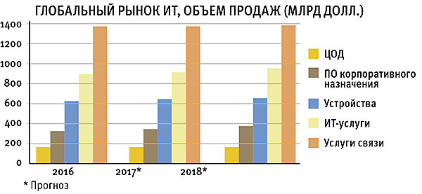 Аналитики значительно скорректировали прогноз роста мирового рынка ИТ. Из-за повышения курса доллара прогнозный объем продаж в денежном выражении уменьшился на 67 млрд долл. по сравнению с тем, что предполагалось в январе, а прогноз роста рынка пришлось снизить с 2,7 до 1,4% в год — до 3,5 трлн долл. Особенно сильно это сказалось на прогнозируемой динамике сегментов ИТ-услуг и услуг связи. Сегмент систем для центров обработки данных в 2017 году вырастет только на 0,3%, полагают аналитики. Несмотря на положительную тенденцию (в прошлом году его объем снизился на 0,1%), серверный рынок по-прежнему развивается медленно. Компании постепенно перестают покупать серверы и вместо этого арендуют вычислительные мощности у облачных провайдеров, отмечают аналитики, что снижает спрос на системы для ЦОД в целом. Сегмент цифровых устройств (ПК, планшетов, ультрамобильных компьютеров и телефонов) вырастет в 2017 году на 1,7%. В 2016 году он сократился на 2,6%.