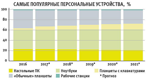 За пять лет с 2016-го до 2021 года продажи персональных компьютерных устройств (компьютеров и планшетов всех видов) в мире снизятся с 435 млн до 405,2 млн штук, полагают в IDC. Тем не менее в 2019 году рынок пройдет низшую точку и снова начнет расти, хотя и небольшими темпами. Хотя в первом квартале 2017 года на рынке ПК впервые с 2012 года был отмечен небольшой рост, аналитики уверены, что вскоре продажи снова начнут падать. При этом в сегменте ноутбуков, в отличие от сегмента настольных компьютеров, рост продолжится благодаря повышению спроса на корпоративном рынке и постепенному росту популярности сверхтонких и гибридных ноутбуков. В сегменте планшетов общая картина остается прежней. Продажи традиционных планшетов быстро падают, тогда как спрос на планшеты с клавиатурами возрастает. Впрочем, в 2016 году продажи планшетов с клавиатурами оказались не настолько высокими, как полагали аналитики, в связи с чем прогнозы пришлось пересмотреть.
